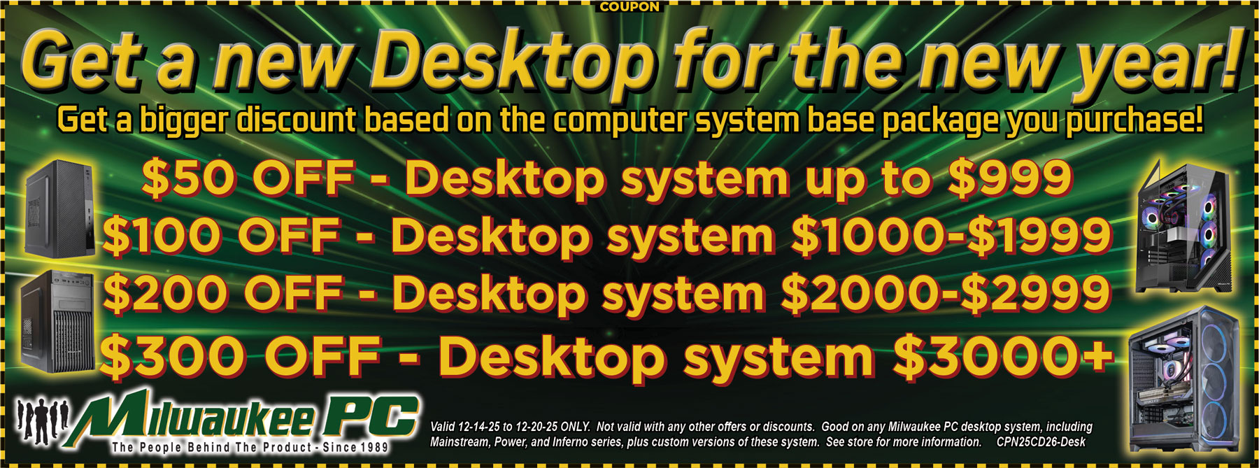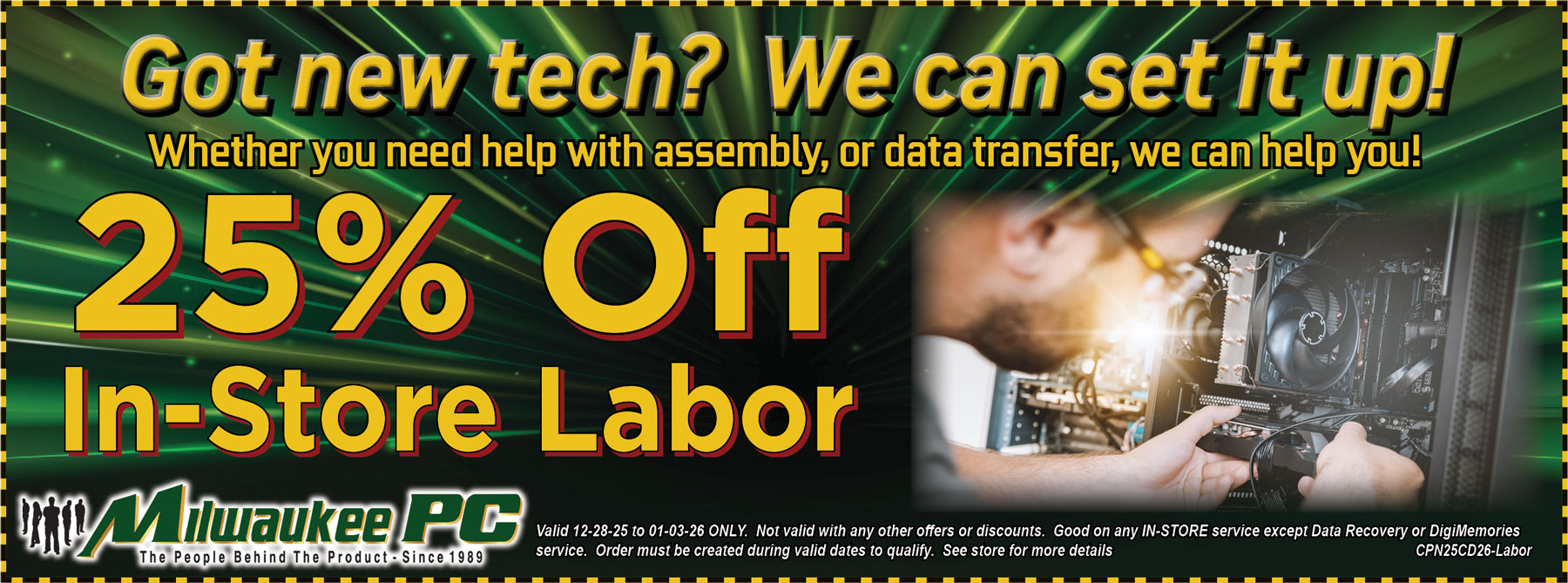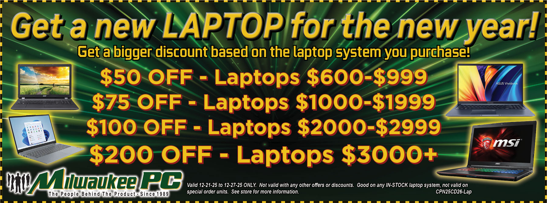 Valid week of 12/21/25 - 12/27/25. Discount on base unit only, no externals, other services may have additional fees. Not valid with any other discounts or offers. See store for more info. Coupon Code: CPN25CD26-Lap. Click on the coupon to see a larger version.